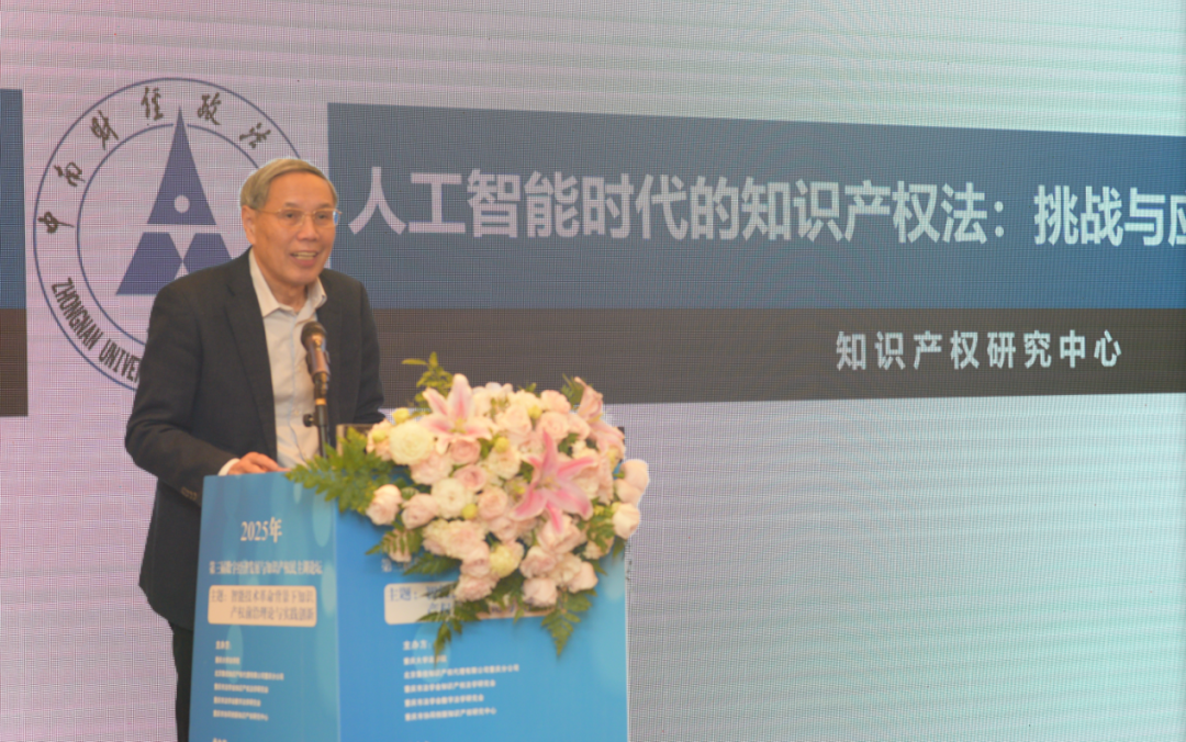 在主旨發言環節,三位專家的發言構成了理論與實務交織的核心對話。中南財經政法大學文瀾資深教授、中國法學會知識產權研究會名譽會長吳漢東以“生成式人工智能時代的知識產權:挑戰與機遇”為題,從制度層面提出知識產權治理的創新思路。他提出,法律人應以“開放的保守主義”或“謹慎的革命主義”回應技術變革,既要認知其創造力與社會影響力,也要堅守制度理性,平衡創新空間與規制價值。
