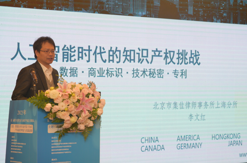 集佳上海分所主任李文紅博士則以“人工智能時代的知識產權挑戰”為題,結合多個典型案例,系統剖析了版權、數據、商業標識、專利四大領域面臨的全新課題。他指出,AI訓練數據的合法使用邊界、生成內容的著作權歸屬、數據權益的司法保護等問題已成為行業焦點,其分享的高德訴萬得不正當競爭案、抖音訴億睿科模型參數侵權案等實務案例,為現場嘉賓提供了極具價值的實踐參考,引發廣泛共鳴。